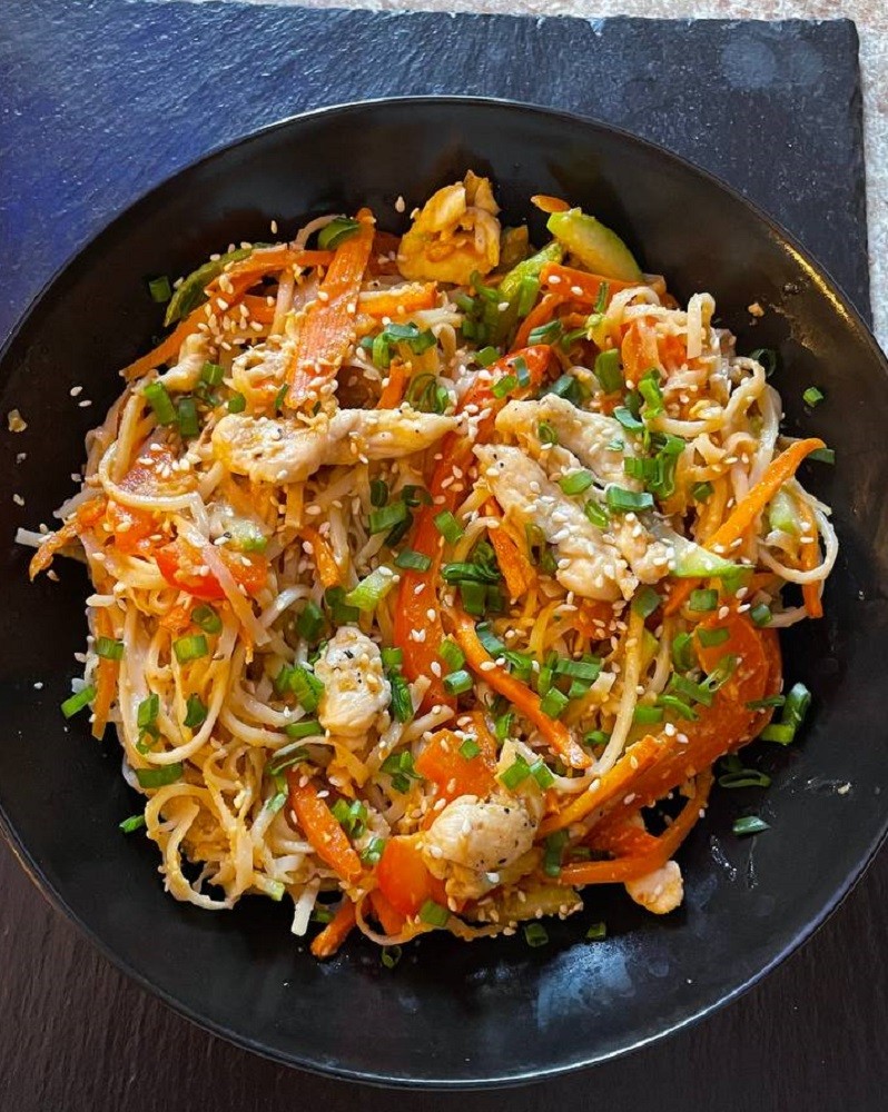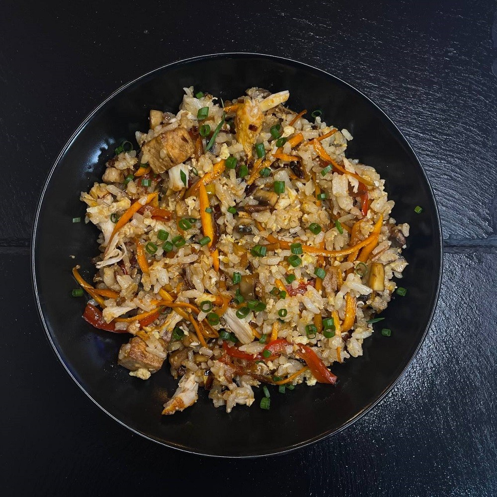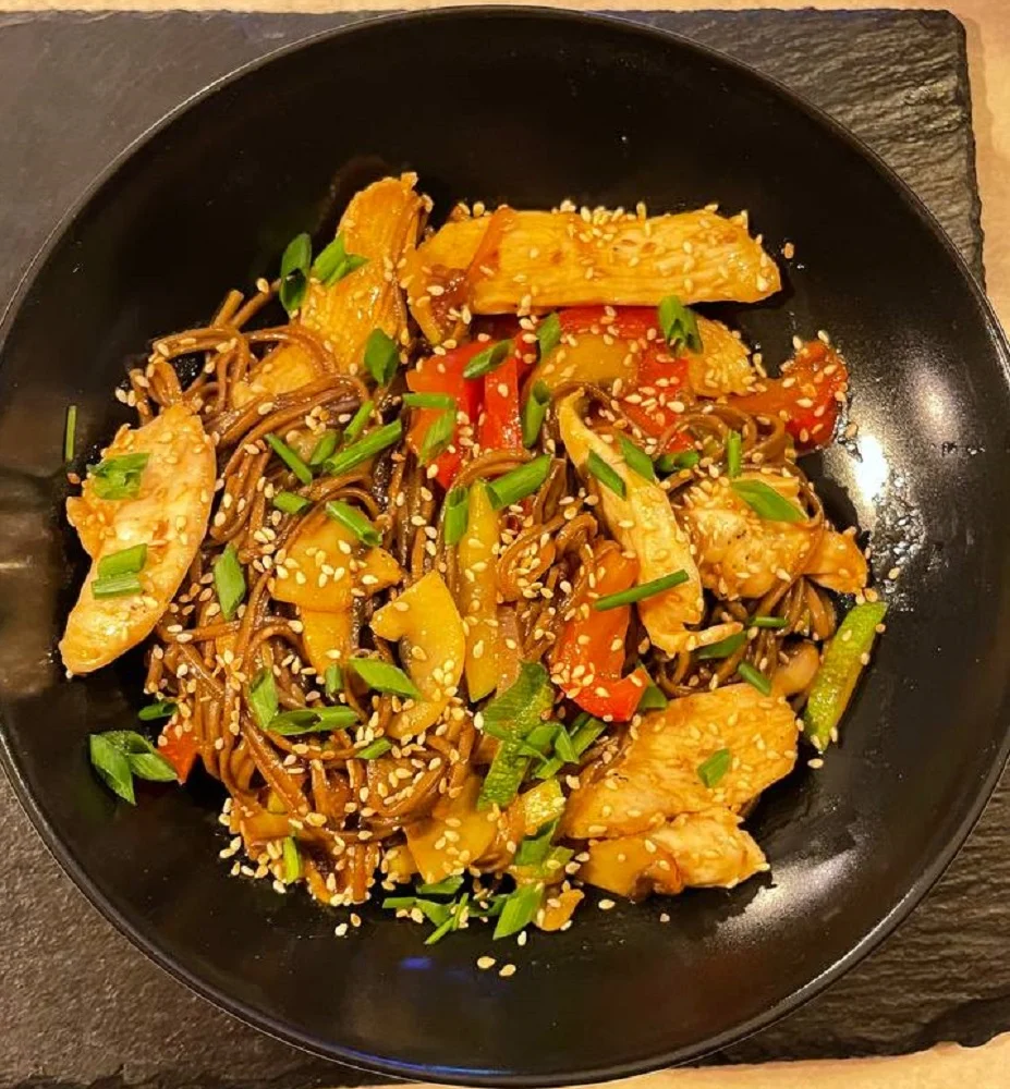 Курка, борошно пшеничне, соєвий соус, соус теріякі, рис, цибуля зелена, кунжут.