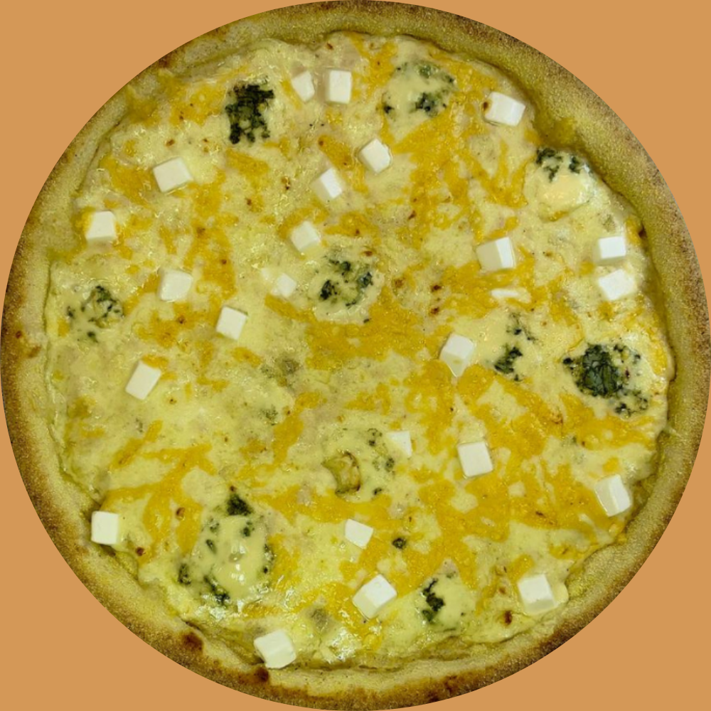 Ферментоване тісто, Основа вершковий соус бешамель, сир Моцарела, сир Чедер, сир Дор Блю, сир Фета.