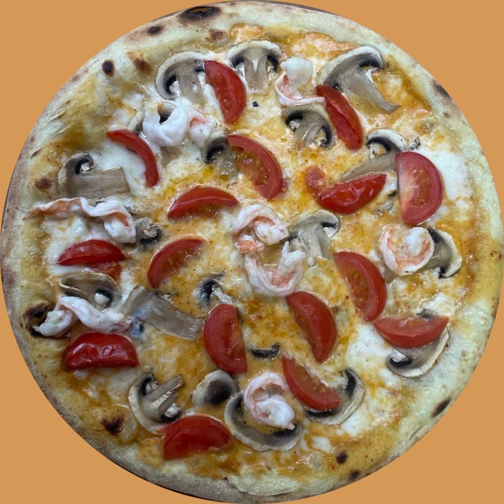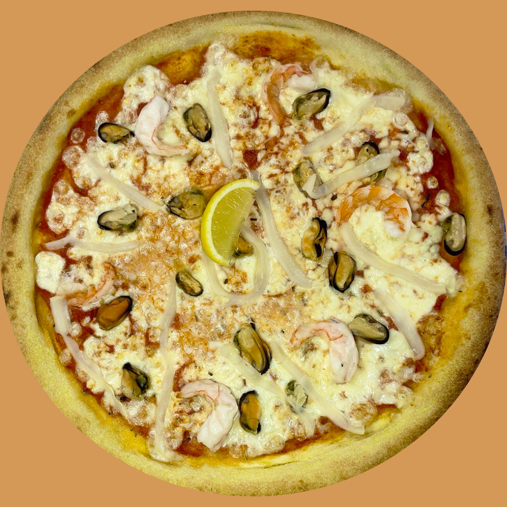 Ферментоване тісто, Томатна основа, сир Моцарела, орегано, мідії, кальмар, креветки тигрові, лимон.