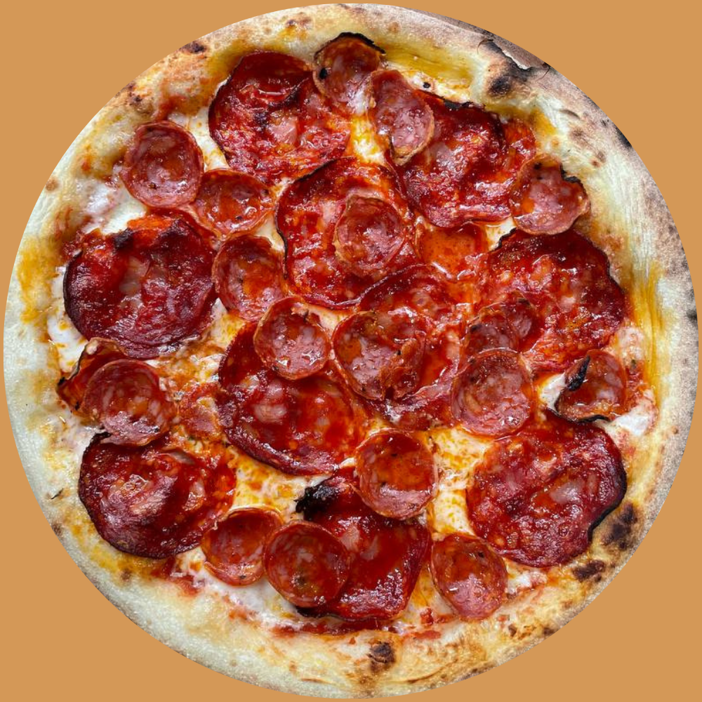 Ферментоване тісто, томатний соус, сир Моцарела, салямі.