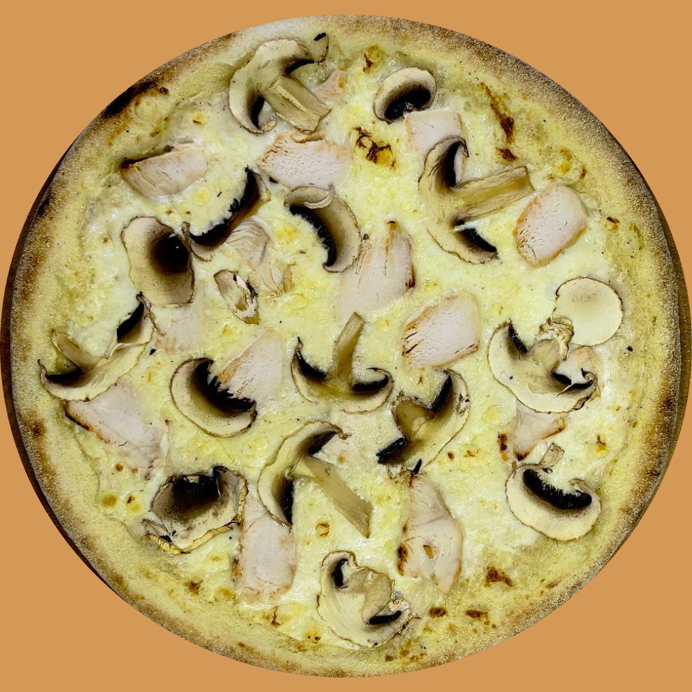 В ЧОТИРИ рази більше Моцарелли. Це справжня смакова симфонія Ферментоване Тісто, Вершковий соус бешамель , сир Моцарела, курка, гриби.