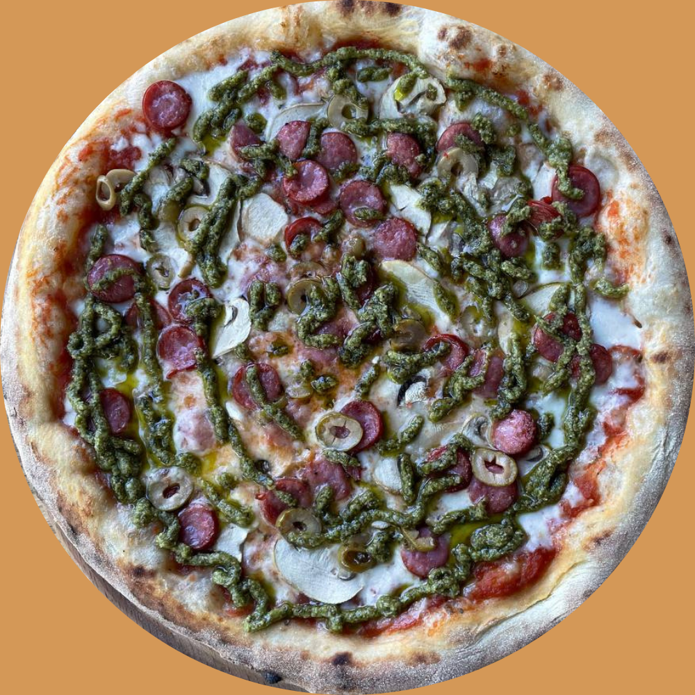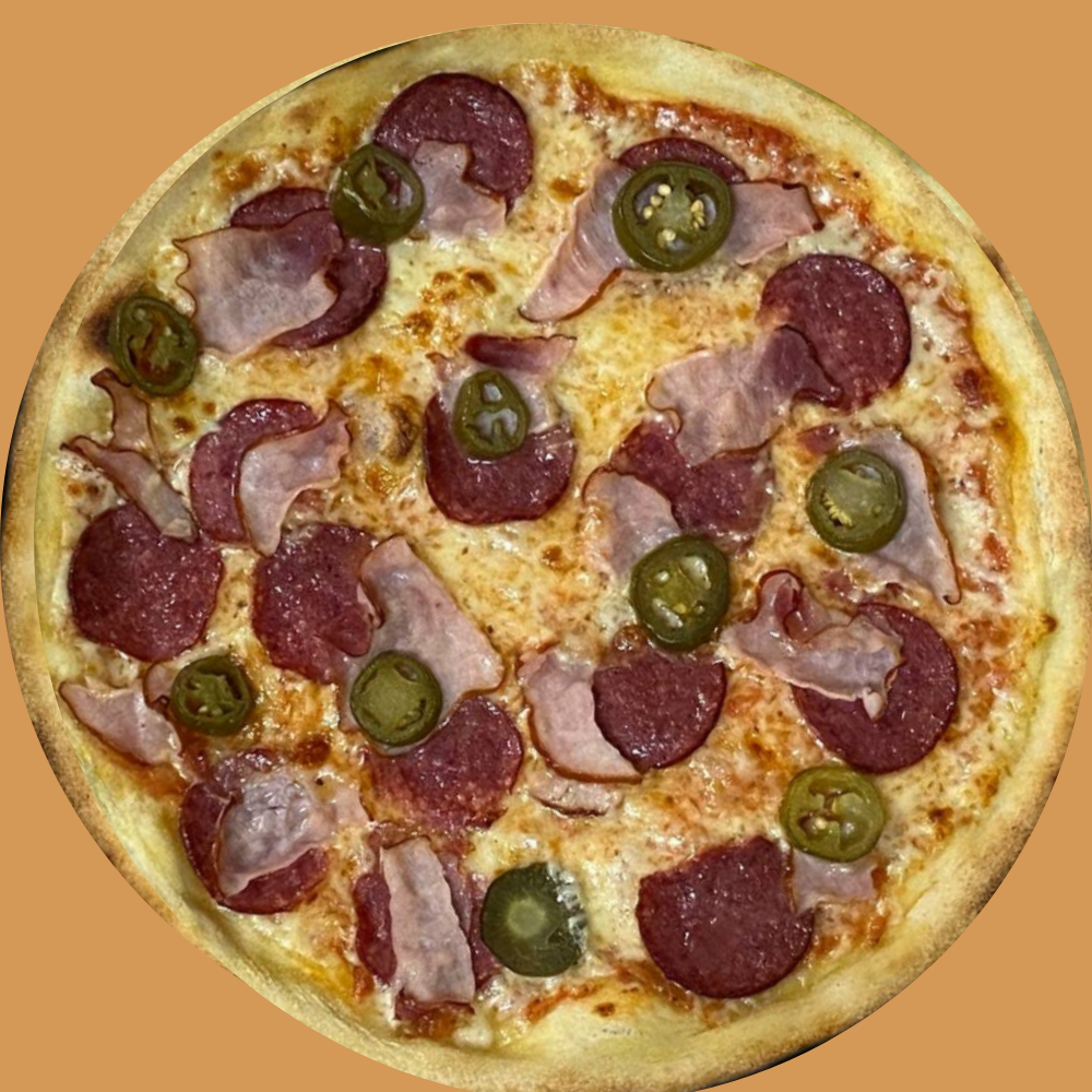 Ферментоване тісто, Основа,Томатний соус, сир Моцарела,, орегано, Салямі, Буженина, перець халапеньйо