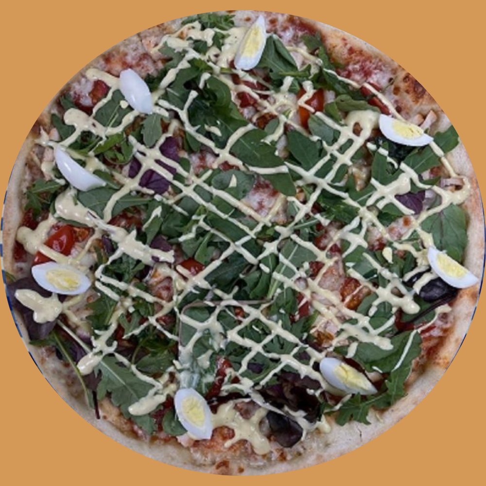 Ферментоване тісто, снова соус Томатний, орегано, сир Моцарела, куряче філе печене, помідори чері, яйця перепелині, соус цезар, сезонний салат.