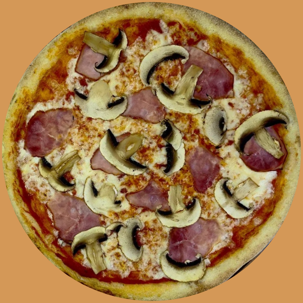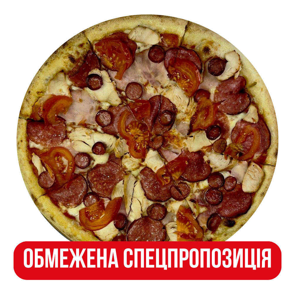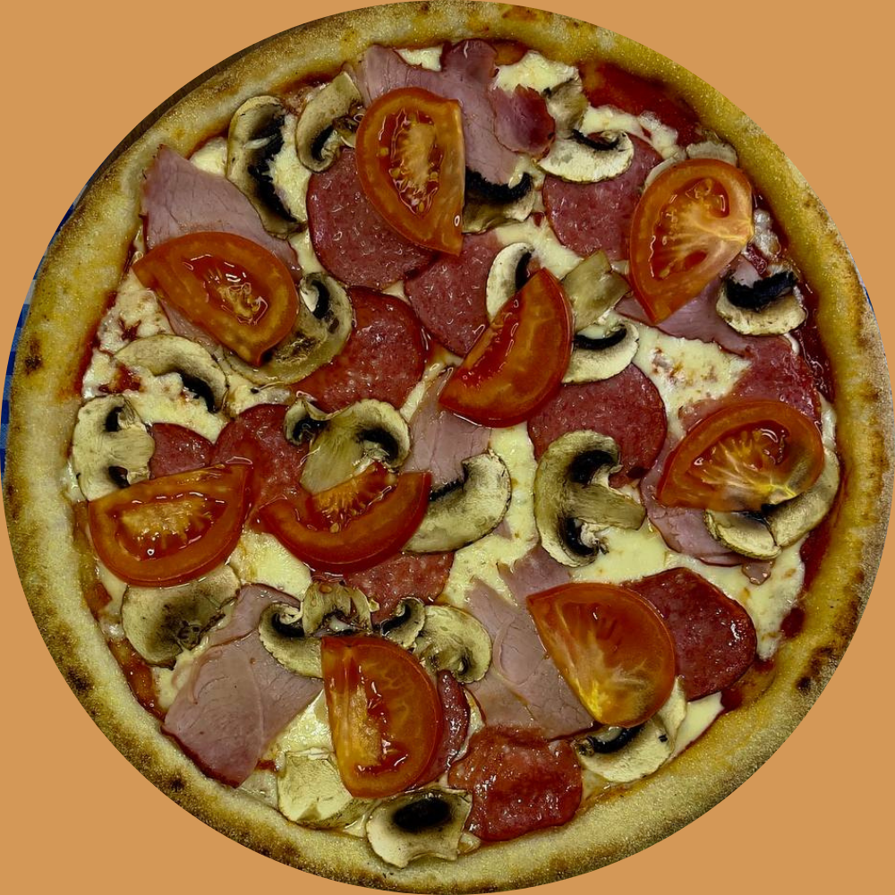 Ферментоване тісто, Основа Томатний соус, сир Моцарела, шинка,Салямі гриби шампіньйони, помідори.