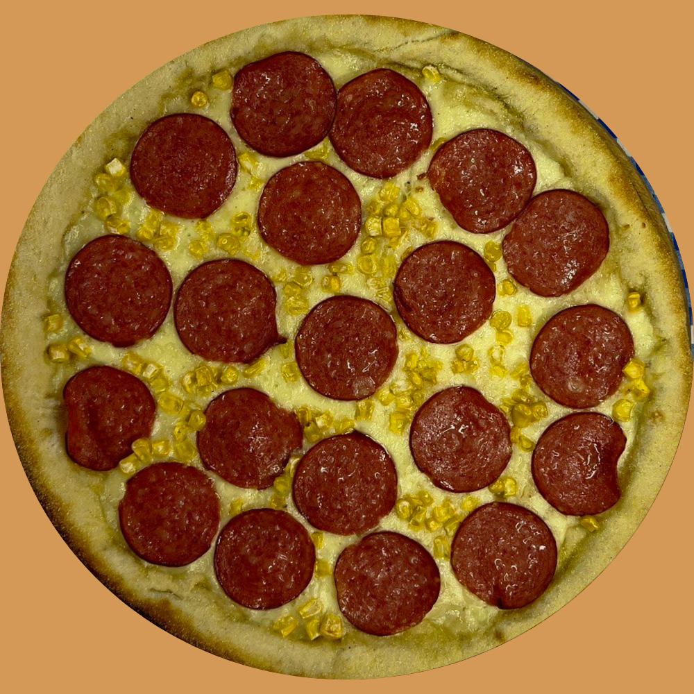 Ферментоване тісто, вершковий соус бешамель, Сир Моцарелла, Салямі, Кукурудза.