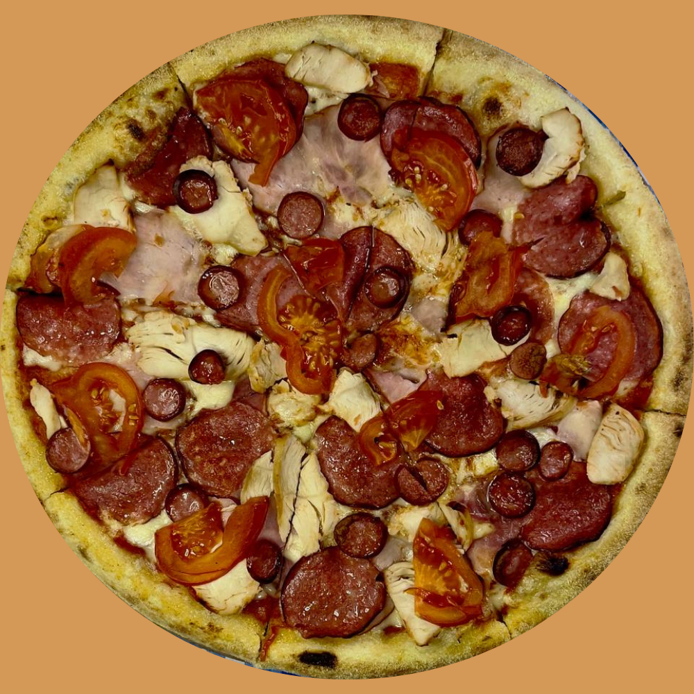 Ферментоване тісто, Томатна основа, сир Моцарела, орегано, помідори, шинка, салямі, Мисливські ковбаски.