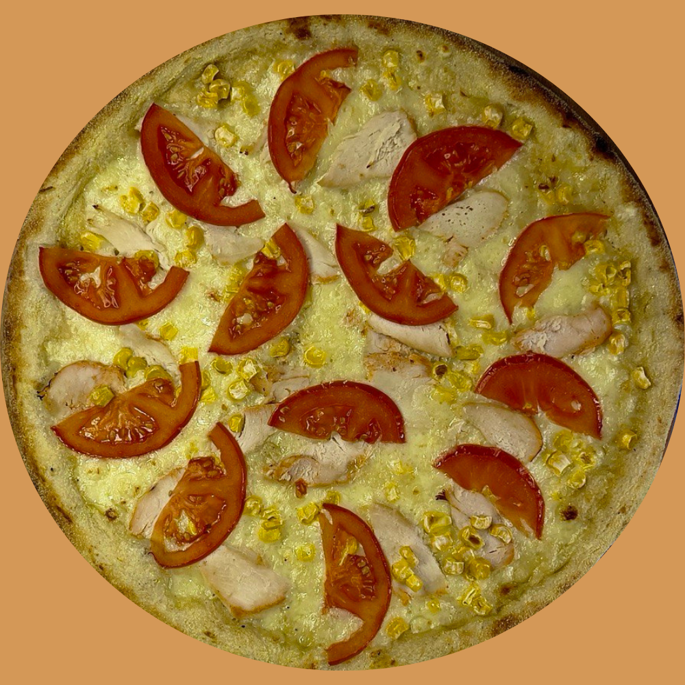 Ферментоване тісто, Основа Вершковий соус Бешамель, Сир Моцарелла, куряче філе печене, кукурудза, помідор.