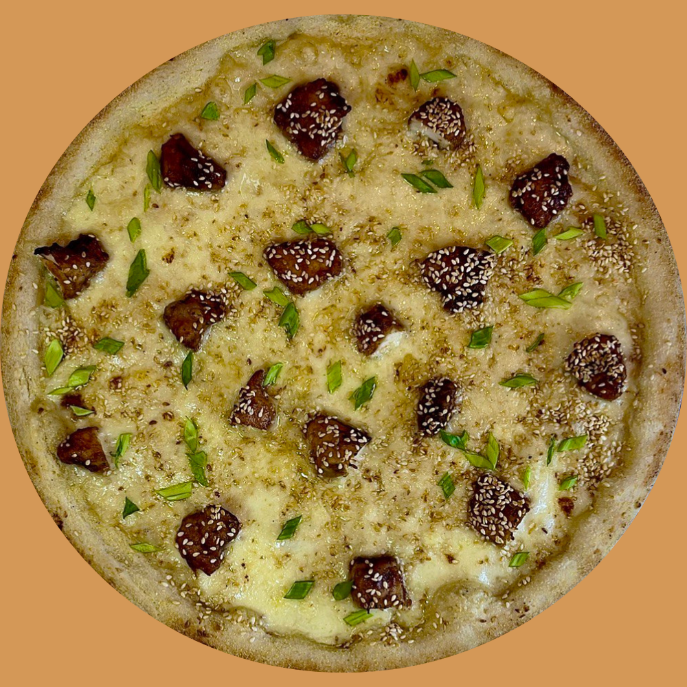 Ферментоване Тісто, Основа Соус Вершковий Бешамель, Сир Моцарелла, Курка в соусі теріякі, Кунжут, цибуля зелена, соус теріякі.