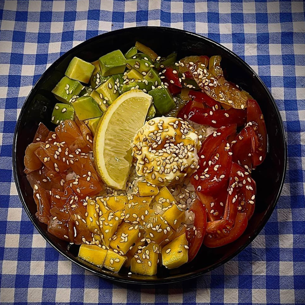 Рис, сир філадельфія, перець болгарський, помідор чері, авокадо, соус теріякі, кунжут, та додаток на вибір.