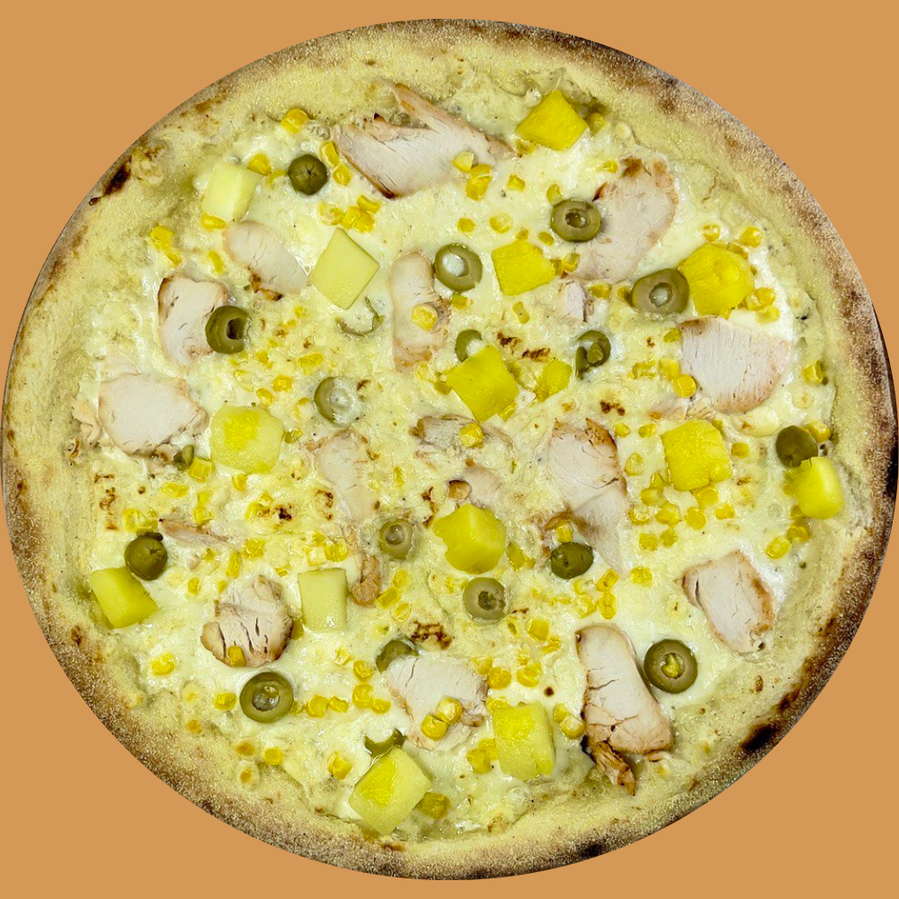 Ферментоване тісто, основа соус вершковий бешамель, сир Моцарела, куряче філе печене, ананас, кукурудза.